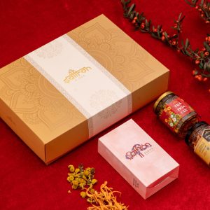 Set quà Saffron SHAHAN04 được đựng trong hộp cứng in họa tiết hoa văn sang trọng, nền nã, thể hiện đẳng sự đẳng cấp. Các sản phẩm saffron, trà, đông trùng đựng trong hộp thủy tinh đẹp mắt, dễ dàng kiểm soát trong quá trình sử dụng.
